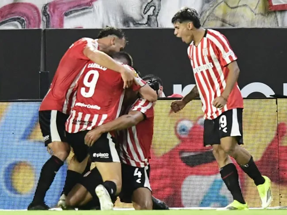 ▲ サンティアゴ・ヌーニェスを祝福するギド・カリージョ(9番)らエストゥディアンテスのイレブン(写真提供:Fotobaires)