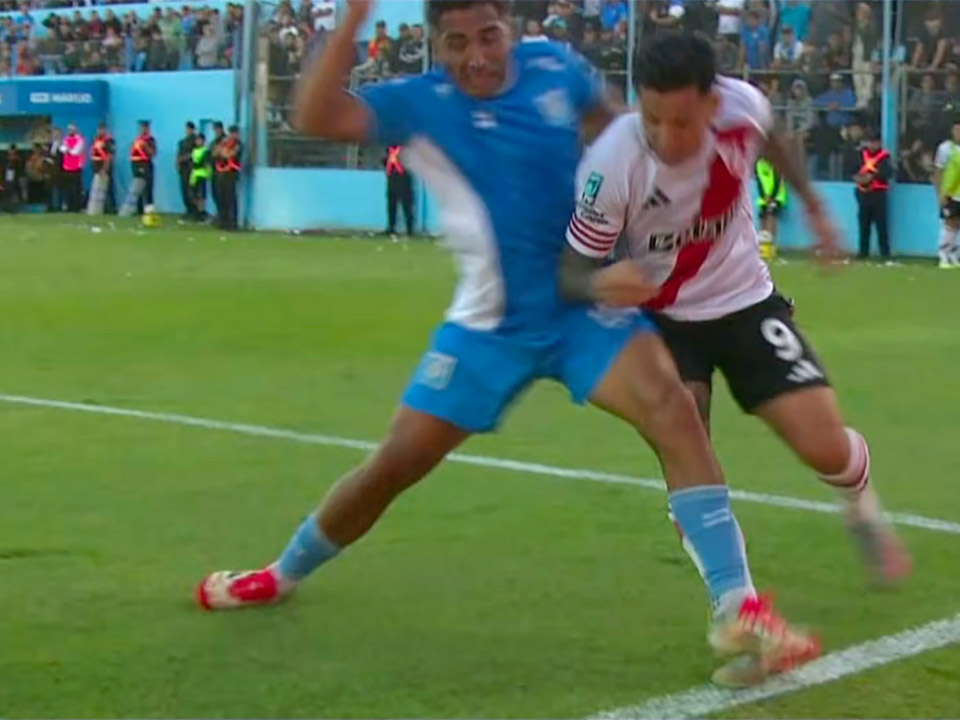 ▲ 64分にセバスティアン・ドリウッシ(9番)がファクンド・コボス(左)に右足を踏まれた瞬間(写真提供:TyC Sports)